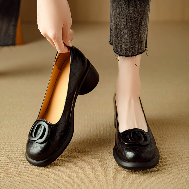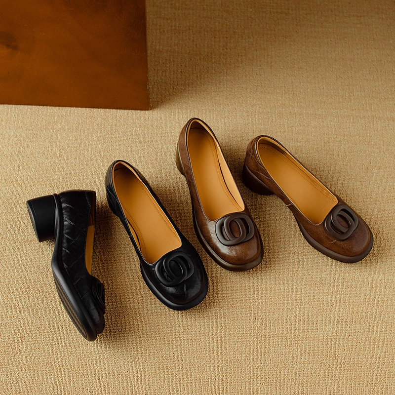 5CM Soft Sole Retro Thick Heel Round-toed Leather Shoes